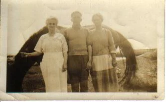 Elizabeth (Coppin) Doherty (1872-1961) with her son David Owen Doherty (1907-1962) and her sister May Lauretta (Coppin) Ross (1877-1948). The three are standing in front of the family's horse Ben.