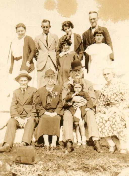 Front Row: John Clarence Power (b. ca. 1840 s/o John and Jane (White) Power); Mary Beatrice (McGrath) Power (b. 1872, d/o John and Margaret (Leary) McGrath); John Michael Power (b. 1867, s/o John Clarence and Mary Ann (Doherty) Power) holding Kathleen Doherty (b. 1931, d/o David and Marian (Beck) Doherty); Elizabeth (Coppin) Doherty.